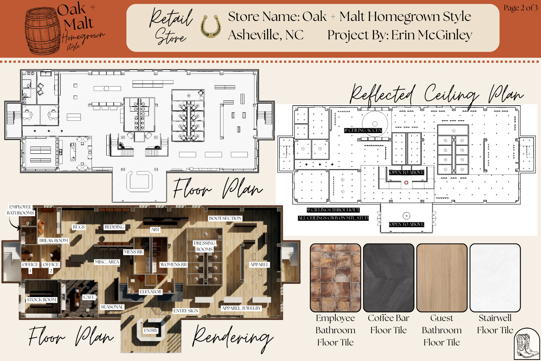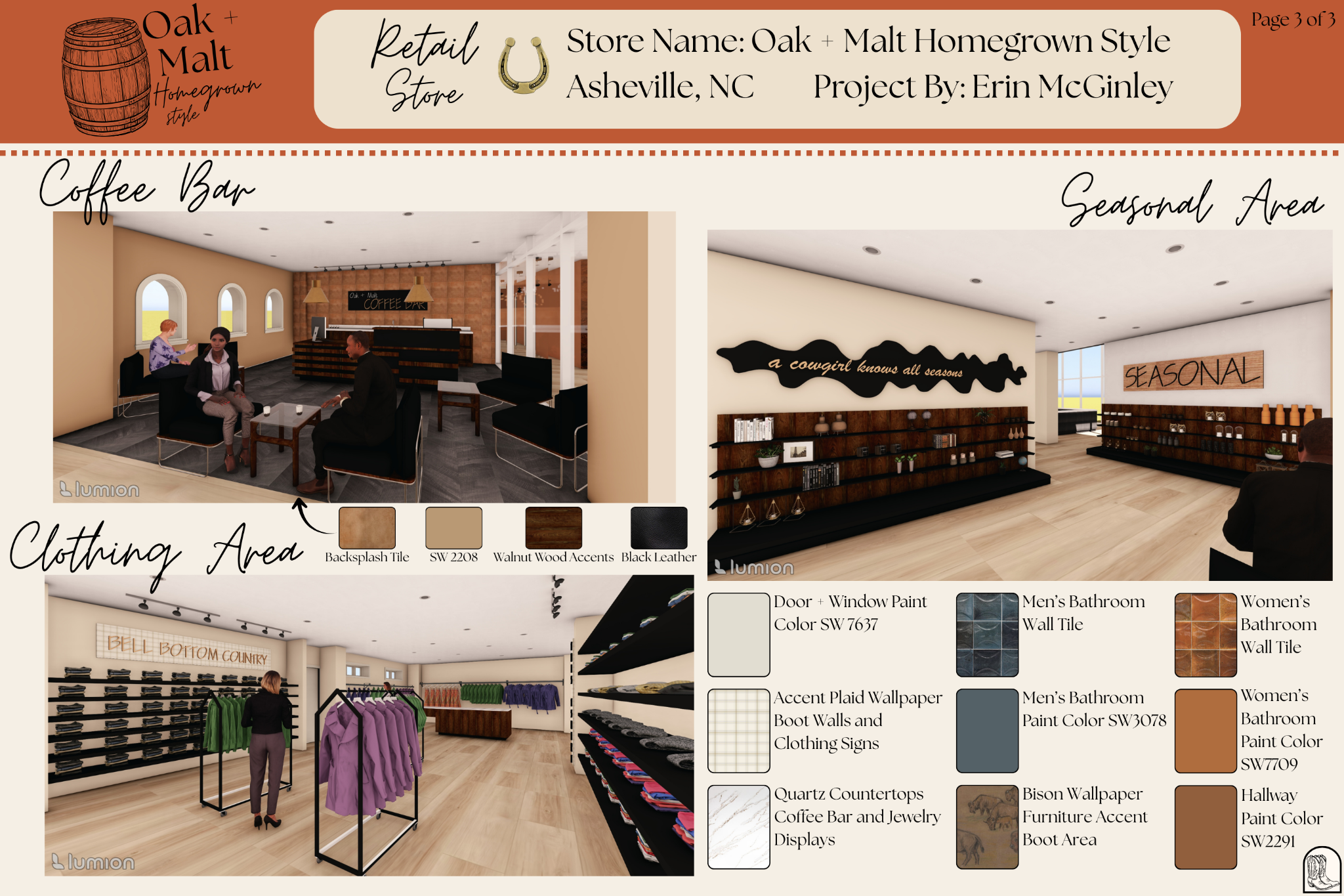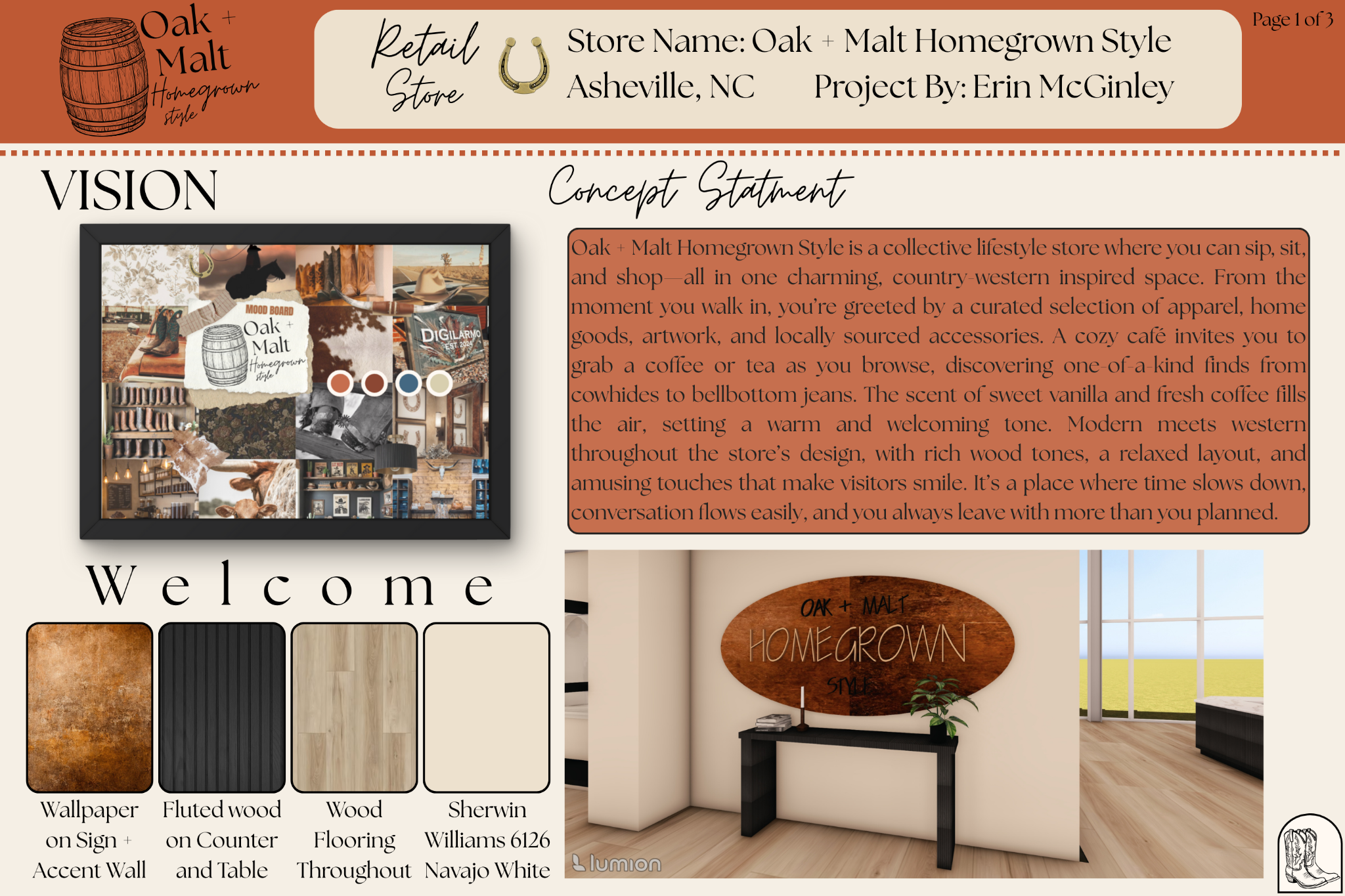 This project focuses on retail design within an existing building shell, allowing for full creative freedom in developing the concept, layout, and overall spatial experience. The program requirements included designing a complete retail environment with product displays, employee restrooms and a break room, management offices, storage areas, seating throughout, public restrooms, and fitting rooms. I created a branded concept for a western-inspired home and clothing store, enhanced with a café space where customers can sit, sip, and enjoy as they explore the shop. The store features departments for seasonal décor, rugs, bedding, artwork, a wide selection of cowboy boots, jeans, T-shirts, dresses, flannels, and jewelry. Incorporating an accessible fitting room and generous walkways was essential, as I wanted the store to feel welcoming and navigable for all customers.