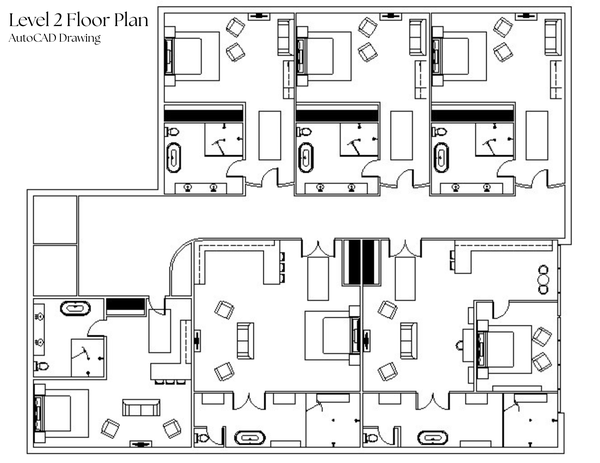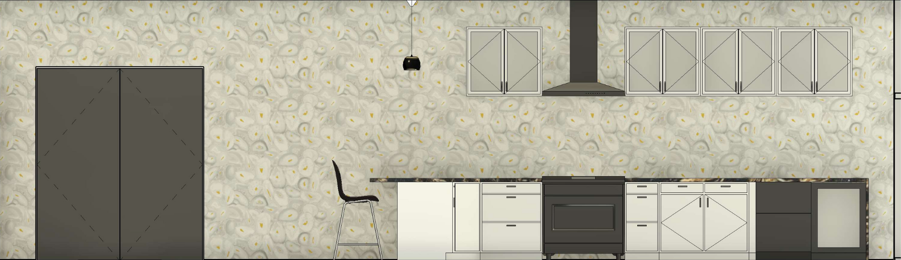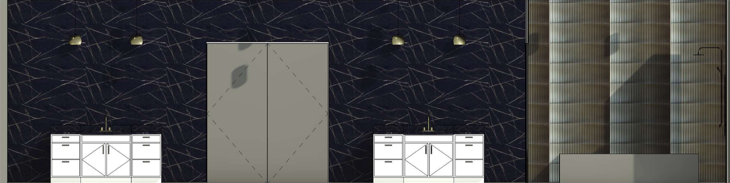 The final deliverables for this project focused on detailed space planning and thoughtful material and fixture selections that would best support Mr. Johnson's accessibility needs in Suite A. This was my first project completed in AutoCAD, and I found the software both intuitive and enjoyable to learn. One key feature I incorporated was the butler's pantry in Suite A. This layout significantly improved accessibility, allowing Mr. Johnson to pass through with ease or retrieve items from the pantry without obstruction. The recessed area by the window also provided the proper turning radius for him to enter and exit through the same doorway comfortably. Additionally, I selected barn doors for several locations throughout Suite A, as my research showed they are ideal for wheelchair users—allowing the door to be pushed open and closed without requiring excessive reach or maneuvering.